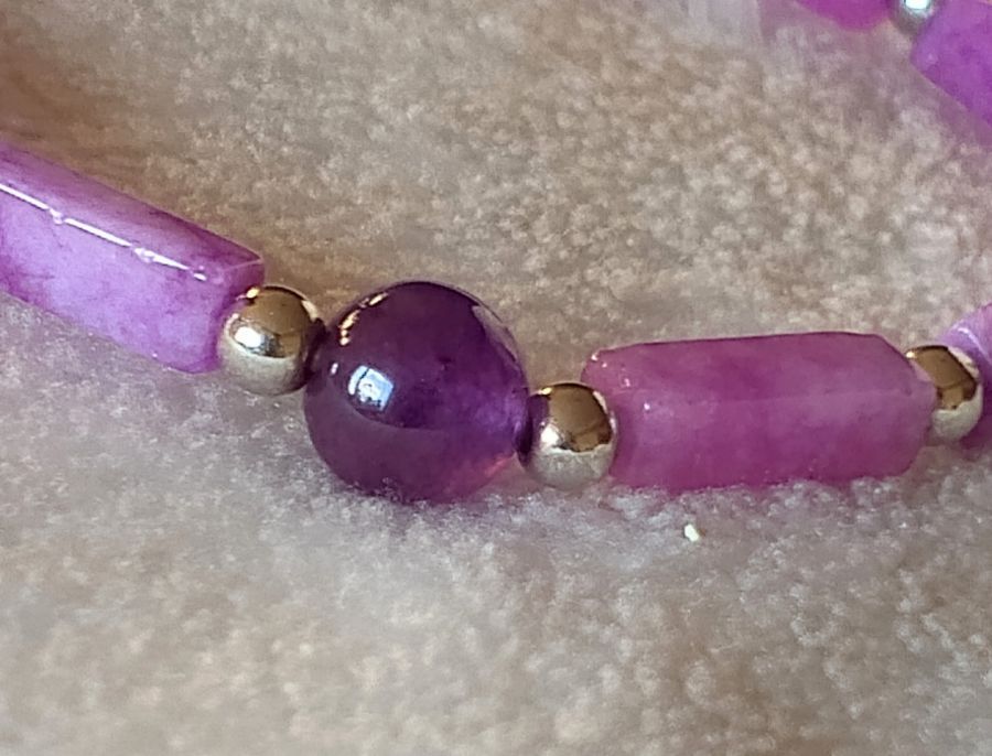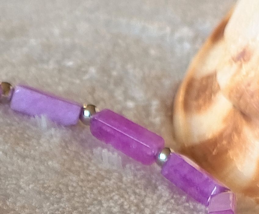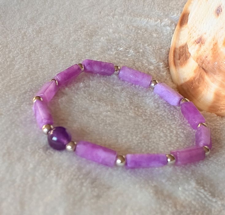 Ochronna bransoletka z naturalnego Ametystu. nośnikiem jest gumka jubilerska . Koraliki wysokość 4 mm szerokość 11 mm. Kulka 6 mm.