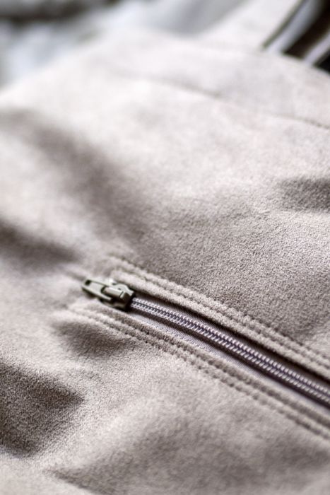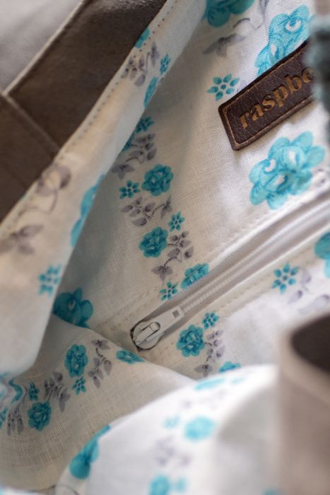Torebka posiada bawełnianą podszewkę w kwiaty, a w środku kieszeń zapinaną na suwak. Z tyłu torby znajduje się dodatkowa kieszonka zapinana na suwak.