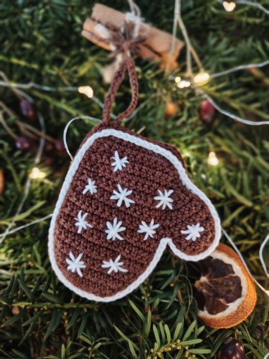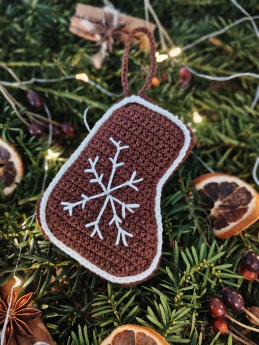 Dwa szydełkowe pierniczki w kształcie skarpety i rękawicy Mikołaja to wyjątkowe ozdoby Twojej choinki lub nietuzinkowy świąteczny prezent i pamiątka na lata.
