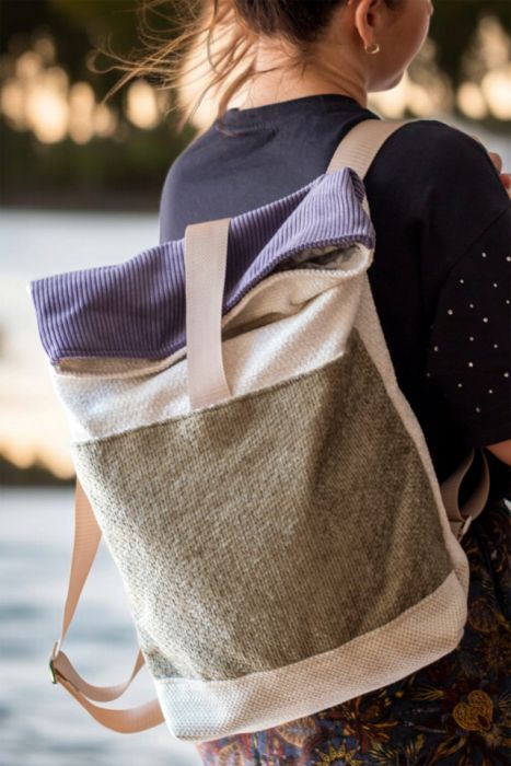 Duży, damski plecak miejski składany i zapinany na rzep wykonany z kilku rodzajów tkanin.