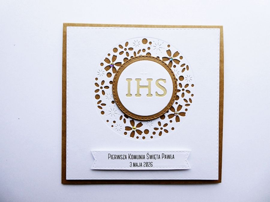 Uroku pamiątce dodaje oryginalna ażurowa wycinanka z motywem kwiatuszków, a sakralny charakter uroczystości podkreśla umieszczona centralnie Hostia.