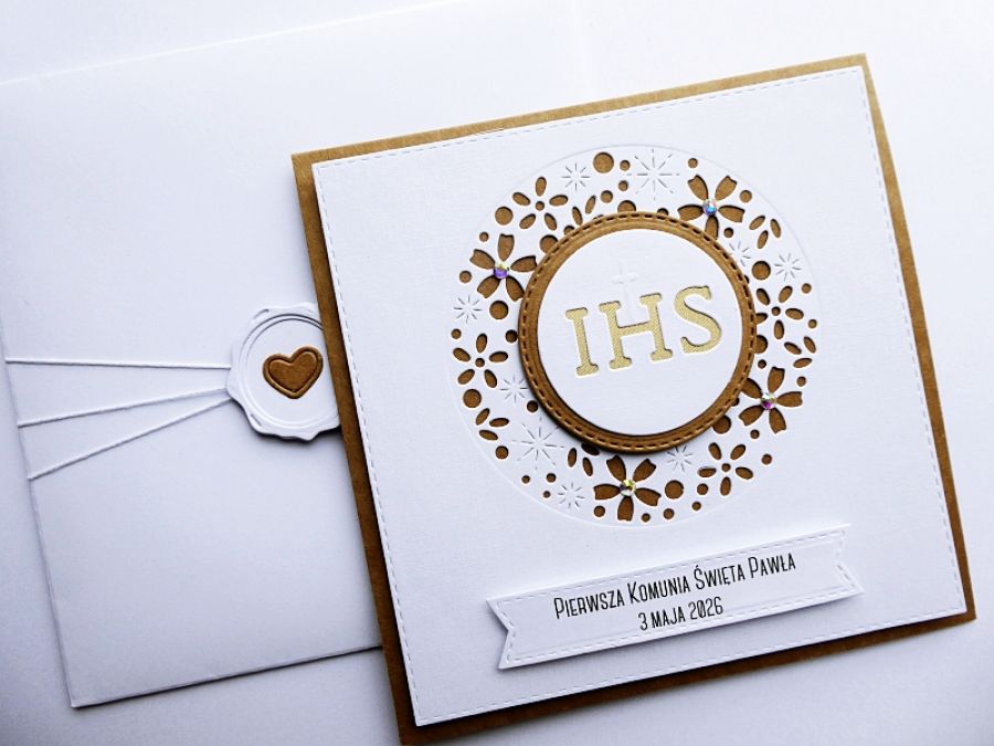 Ręcznie wykonana kartka z okazji Pierwszej Komunii Świętej w komplecie z ozdobioną kopertą - skromna, a jednocześnie stylowa.