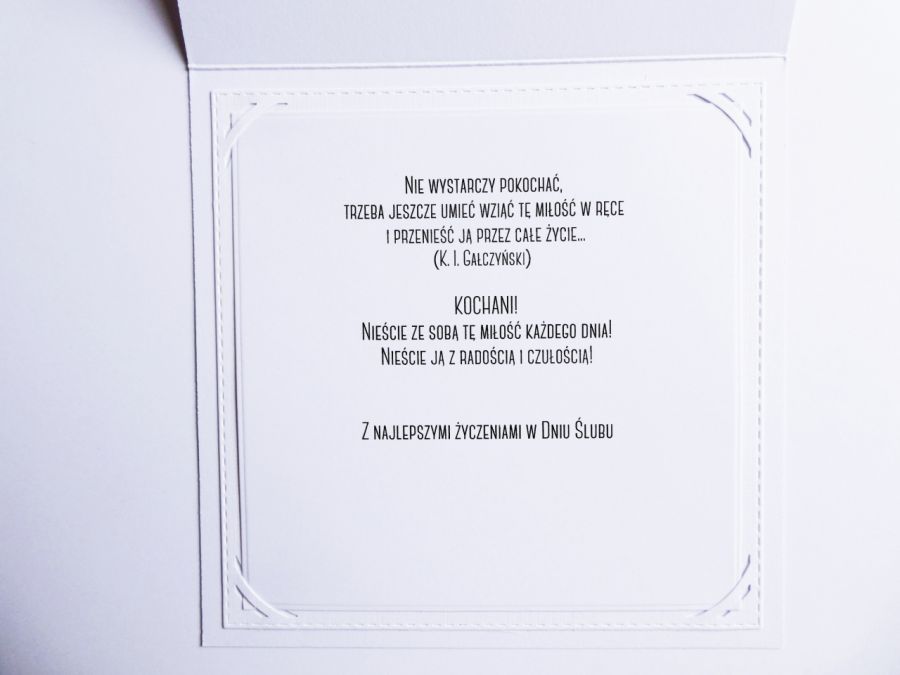 Kartka ma wklejony w środku biały karnecik, w którym umieszczona została wkładka z życzeniami.