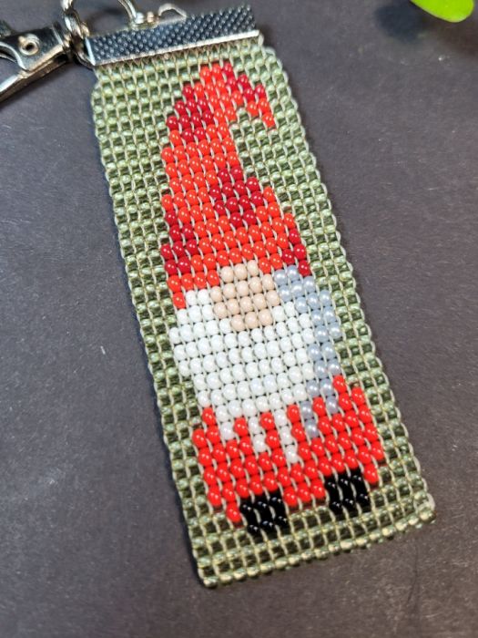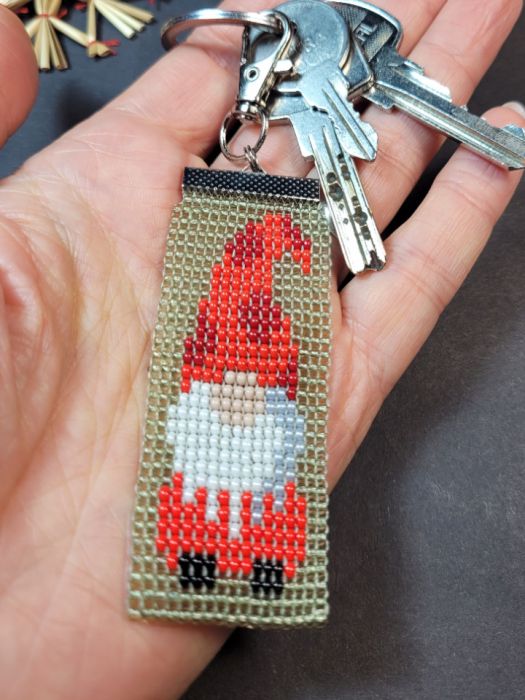 Ręcznie wykonany brelok przedstawiający krasnala w czerwonym stroju. Utkany ręcznie z wysokiej jakości czeskich koralików Preciosa.