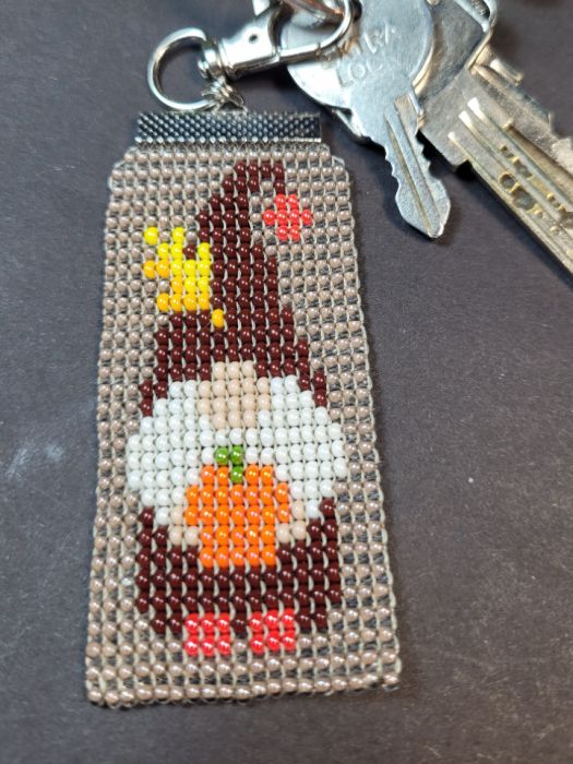 Ręcznie wykonany brelok przedstawiający krasnala w ciemno-brązowym stroju z dyną. Utkany ręcznie z wysokiej jakości czeskich koralików Preciosa.