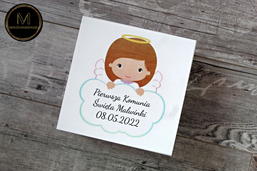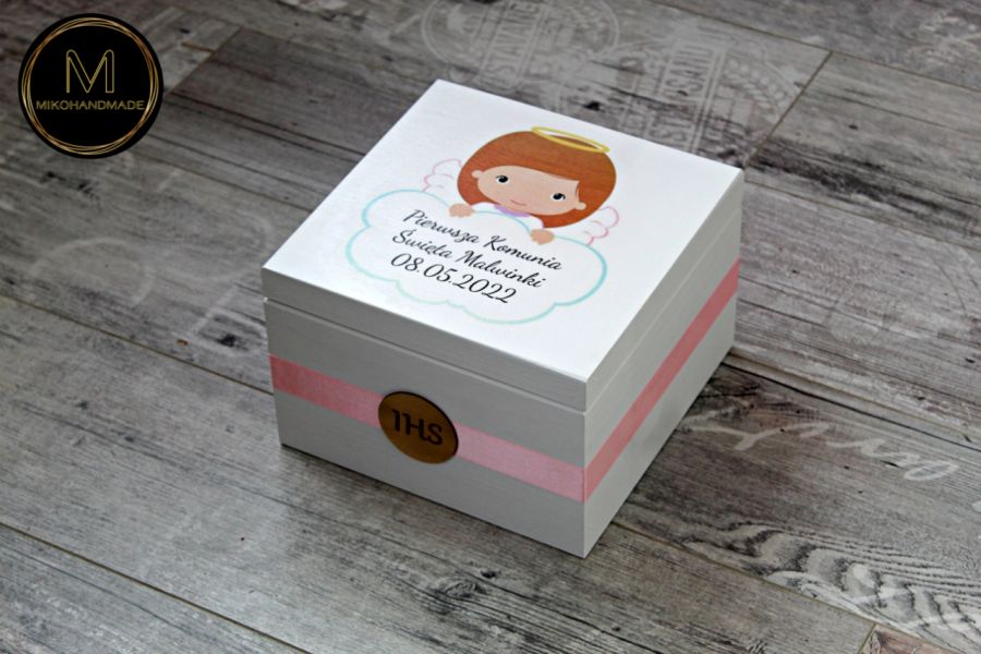 - Wygląd: pudełko zostało starannie pomalowane na biało, co nadaje mu delikatności i elegancji. Na wieku znajduje się uroczy, ręcznie naniesiony wzór przedstawiający Aniołka na obłoczku – symbol opieki i niewinności, idealnie komponujący się z charakterem tego dnia.