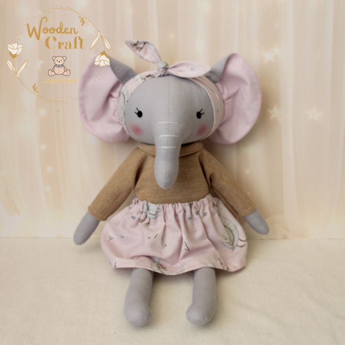Przeurocza przytulanka słonik, a właściwie słoniczka w kolorze szarym, uszyta ręcznie z najwyższą starannością, ubrana w uroczy beżowy sweterek oraz pudrowo-różową spódniczkę z motywem gąsek, z pudrowo-różową opaską na głowie. Wykonana ze 100% bawełny, wypełniona antyalergiczną kulką silikonową. Oczka malowane wodoodpornym markerem. Górne i dolne łapki układają się luźno, słoniczka siedzi z podparciem. Zarówno sweterek jak i spódniczkę można swobodnie zdejmować, w pasie jest wciągnięta gumeczka.