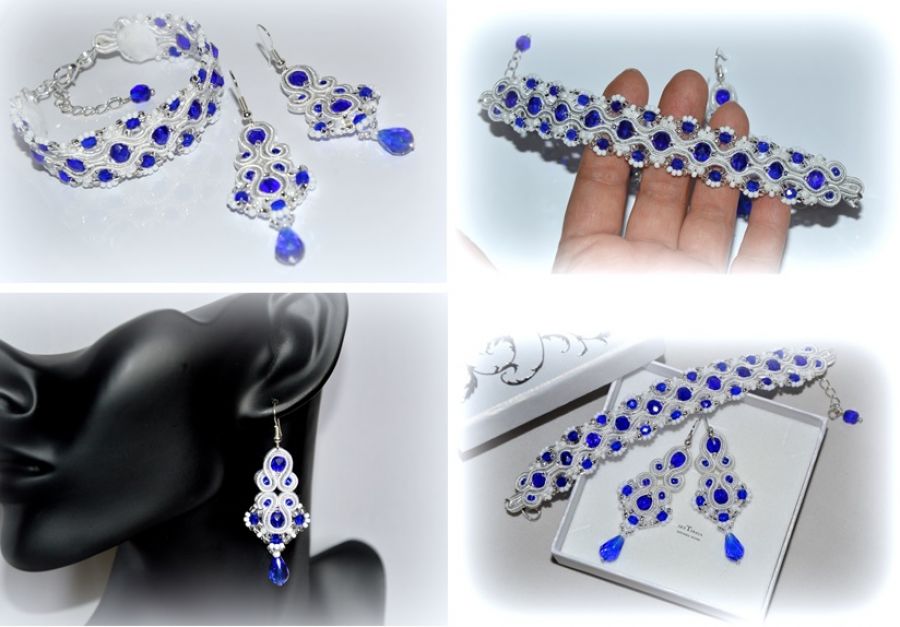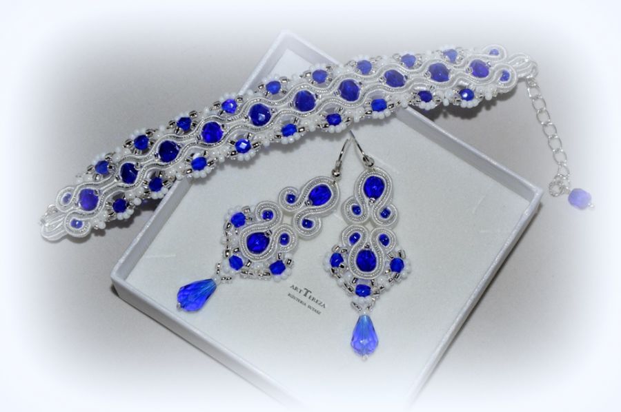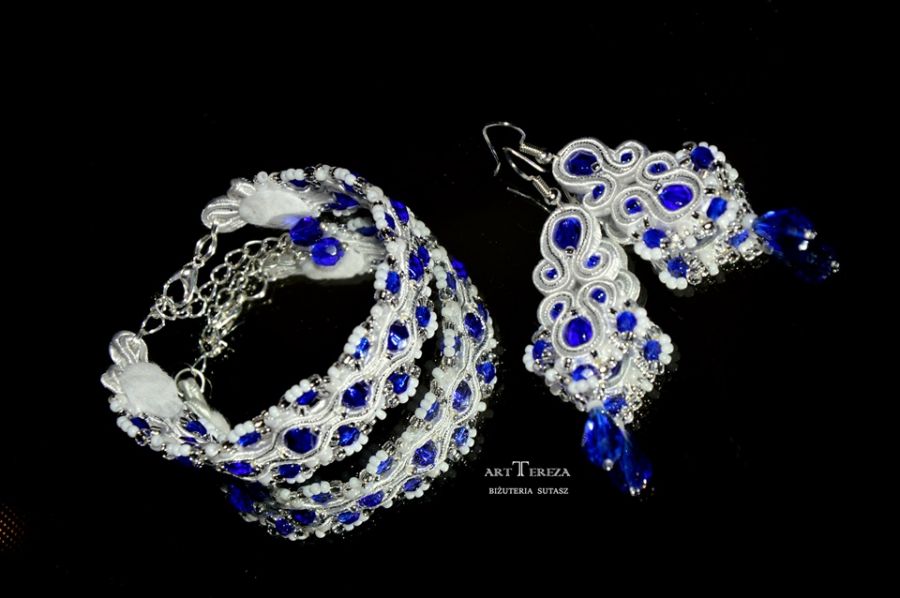 Szkło, Posrebrzane, Tkanina,koraliki kryształki kolor szafir, koraliki japońskie TOHO w kolorze srebrzystym i białym,bigle i zapięcie - karabińczyk posrebrzane, sutasz biały i srebrny.