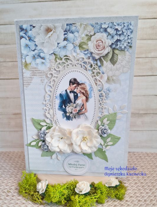 Wyjątkowa, ręcznie wykonana kartka ślubna stworzona z myślą o najpiękniejszych emocjach i niezapomnianych chwilach. Kompozycja utrzymana w delikatnej, romantycznej kolorystyce błękitów i bieli, bogato zdobiona motywami kwiatowymi oraz misternymi detalami.
