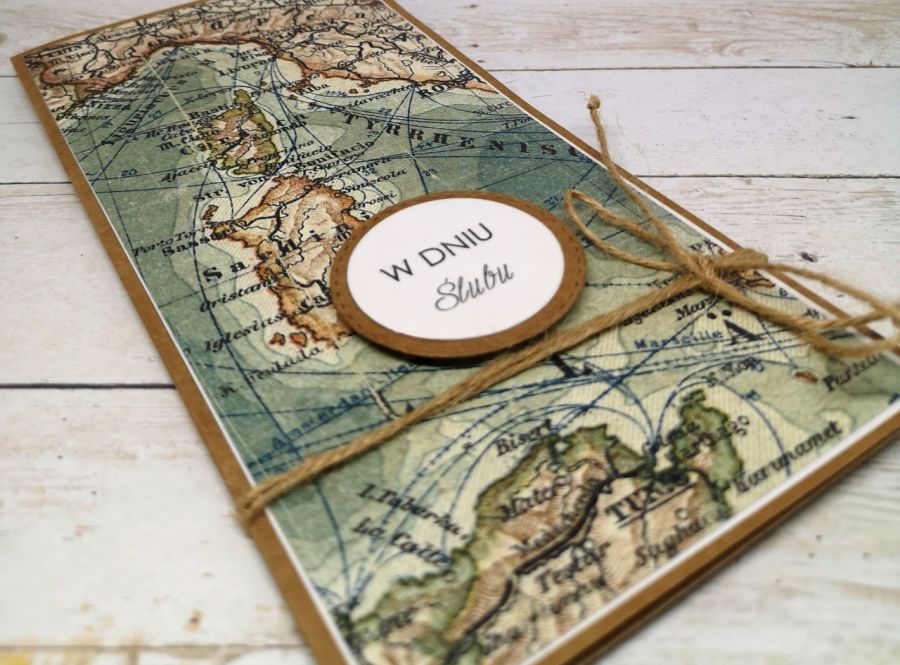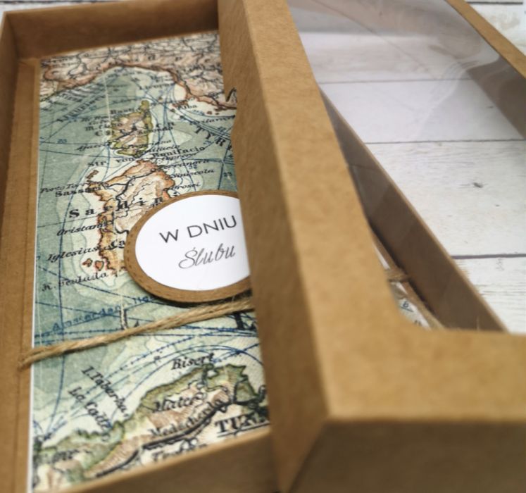 Ślubna kartka dla podróżników w komplecie z pudełkiem z okienkiem. Z symbolicznym motywem mapy, nawiązującym do wspólnego podróżowania.