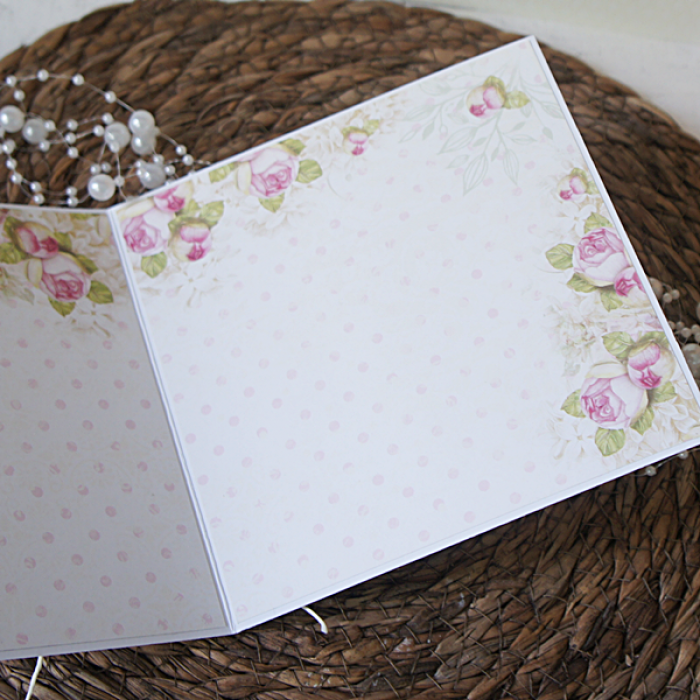 Ozdobiona pięknym, eleganckim papierem polskiego producenta, dużym przestrzennym bukietem, perełkami, tekturkami w naturalnym kolorze.