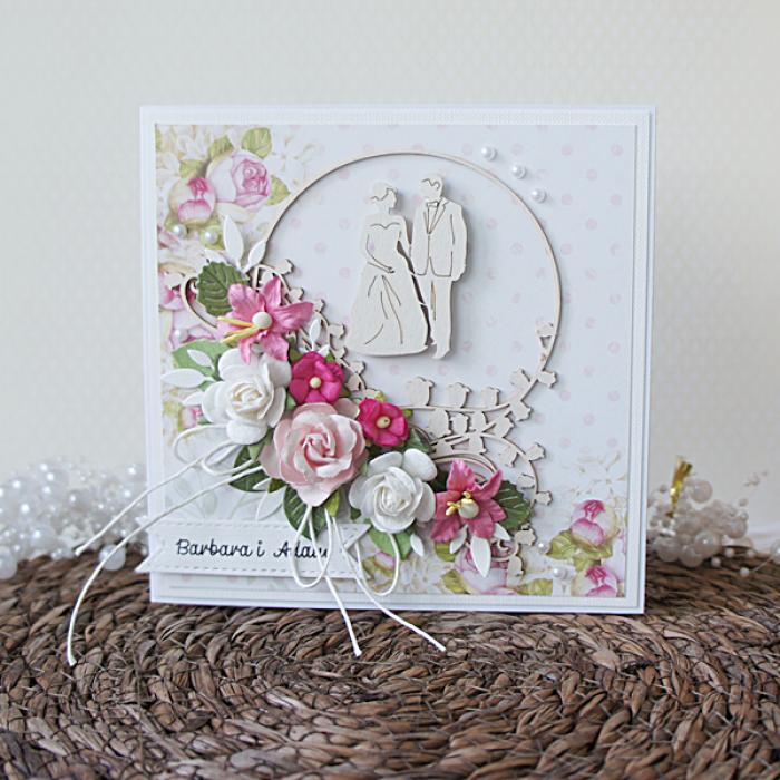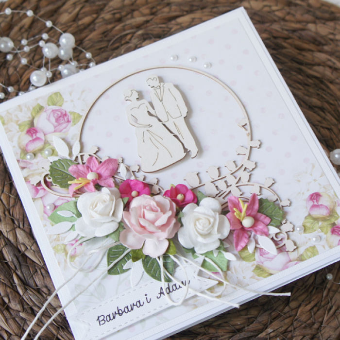 Urocza i bardzo romantyczna kartka ślubna dla wyjątkowej pary w komplecie z białym pudełkiem.