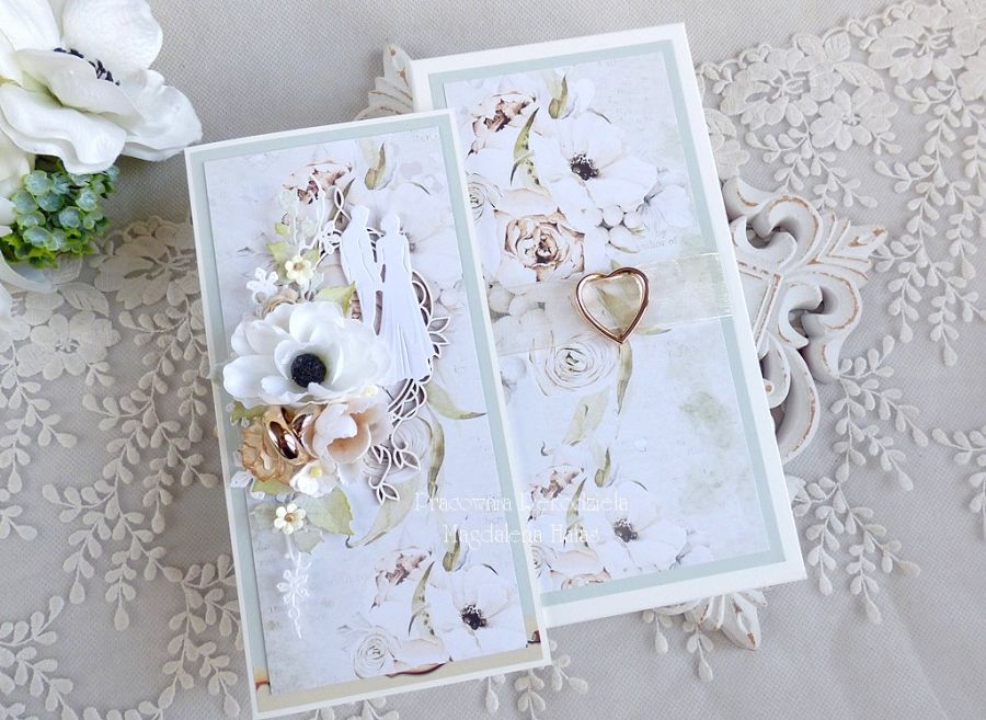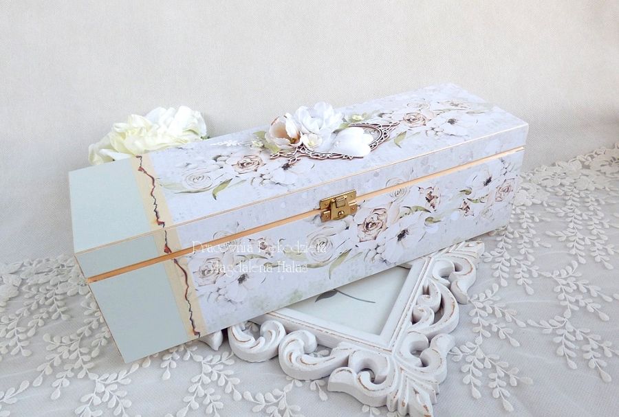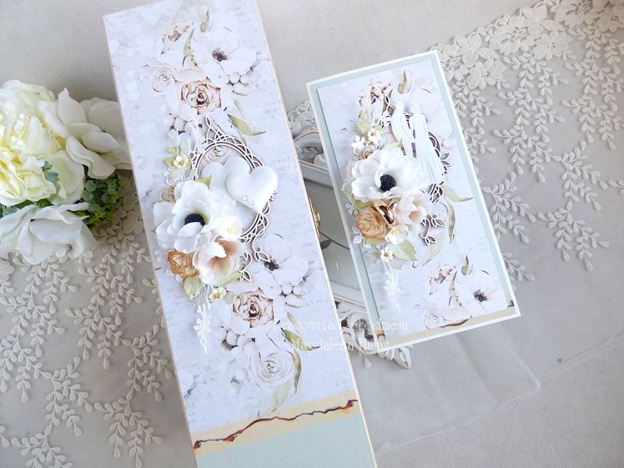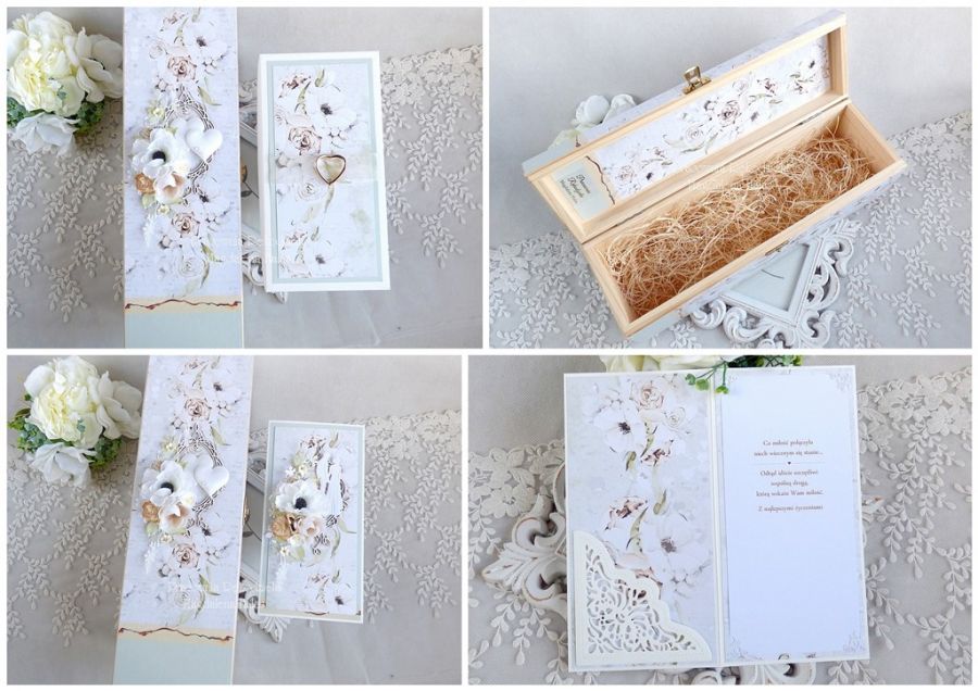 Drewniane pudełko oraz kartka ozdobione są ślicznymi papierami scrapowymi polskich producentów, kwiatami oraz innymi dodatkami.