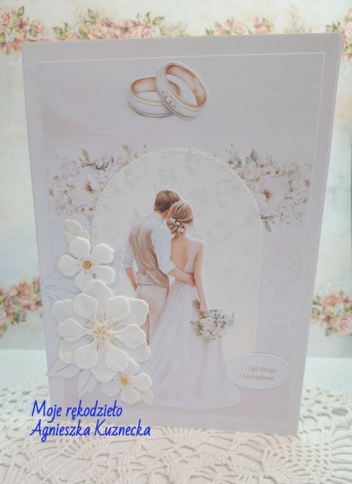 Wyjątkowa, ręcznie wykonana kartka ślubna stworzona z myślą o najpiękniejszych emocjach i niezapomnianych chwilach. Kompozycja utrzymana w delikatnej, romantycznej bieli.