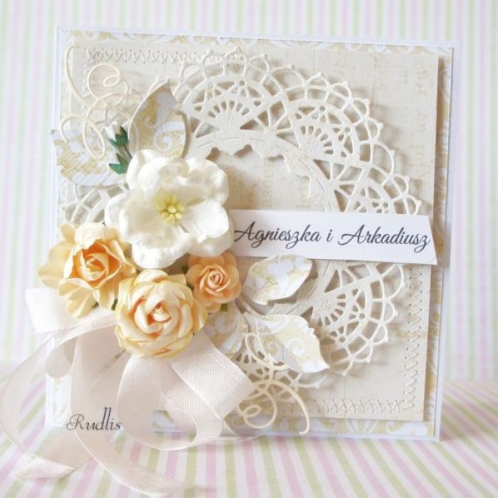 Jestem zachwycona! Karta piękniejsza niż przedstawiona na zdjęciu. Wszystkie moje prośby zostały uwzględnione i wykonane. Na pewno będę jeszcze zamawiać kartki i pudełeczka u Pani Rudlis :D