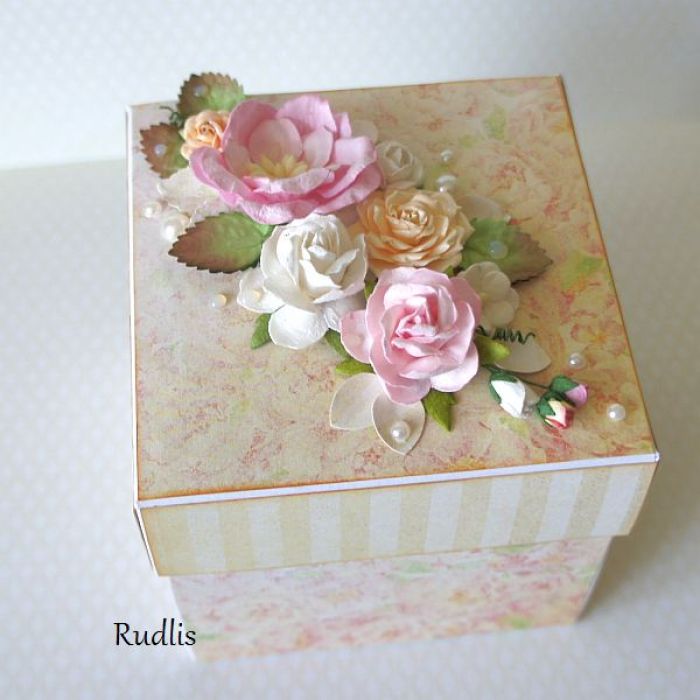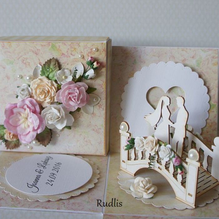 Wyjątkowo oryginalne pudełko z okazji ślubu. Wykonane ręcznie z najwyższej jakości materiałów do scrapbookingu. W ściankach piękny cytat, miejsce na imiona Pary Młodej, oraz jedna kieszonka na prezent gotówkowy. Na środku pudełka tekturka Para Młoda na mostu, całość ozdobiona pięknymi, delikatnymi kwiatami, perełkami.