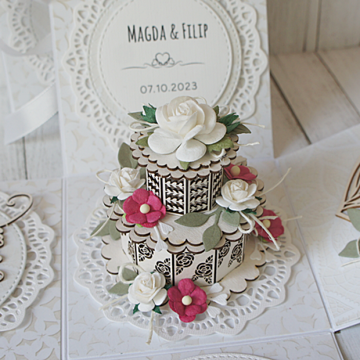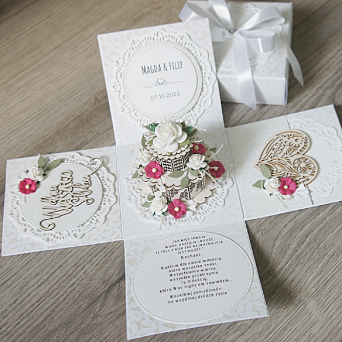 Zadaj pytanie dotyczące produktu: Ślubny Exploding box "White & Cream" z tortem