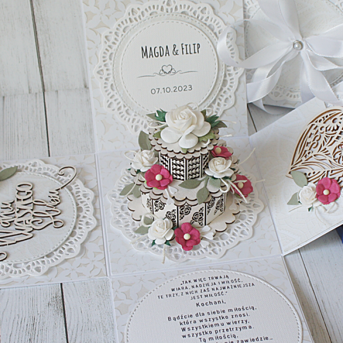 Oryginalny, bogato zdobiony exploding box utrzymany w kolorystyce białej i ecru.