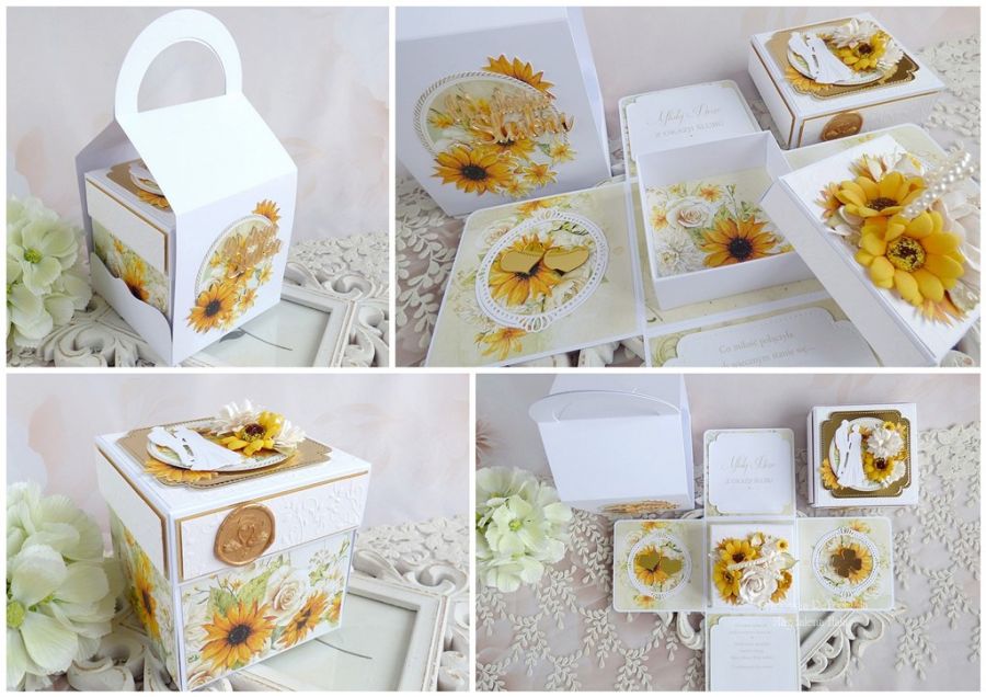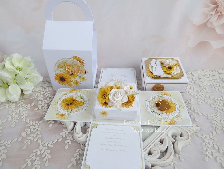 Komplet ozdobiony jest pięknymi papierami scrapowymi i tłoczonymi polskich producentów, motywami ze złotej plexi, kwiatami, małym pudełkiem na drobny prezent lub pieniądze o wymiarach 8x8x3,5 cm oraz innymi dodatkami.