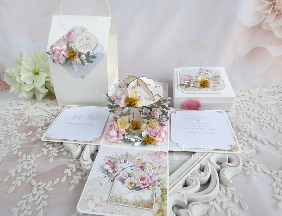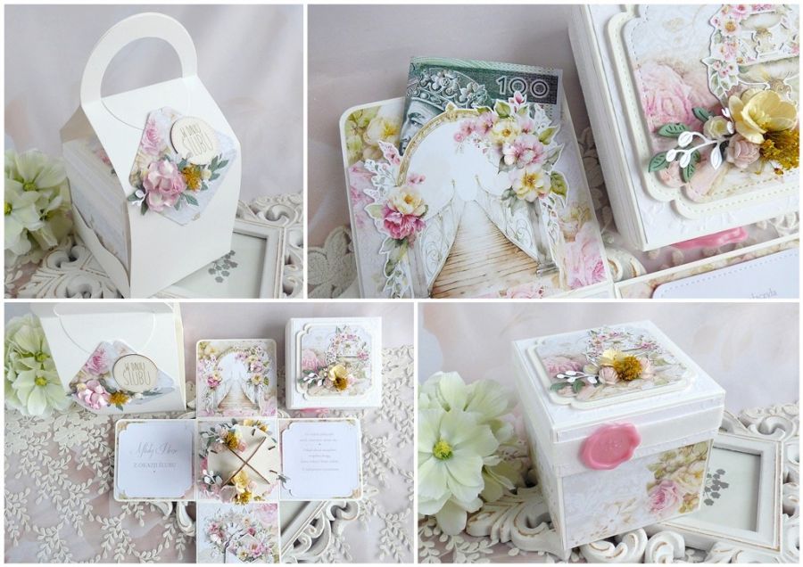 Pudełko ozdobione jest pięknymi papierami scrapowymi i tłoczonymi polskich producentów, grafikami, kwiatami oraz innymi dodatkami. Środek pudełka zdobi altanka 3D. Na jednej ściance umieszczona jest kieszonka na prazent pieniężny.