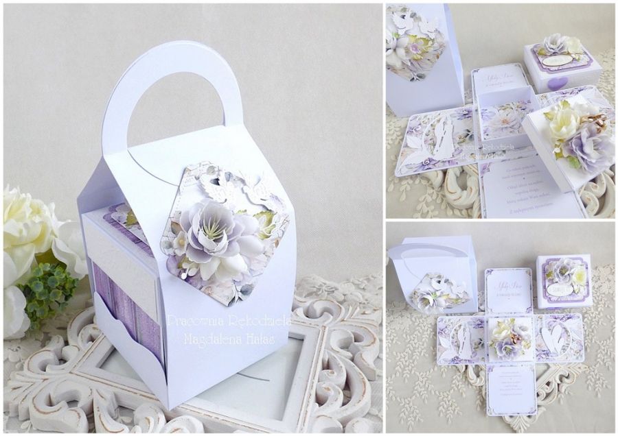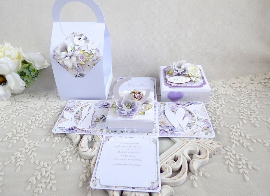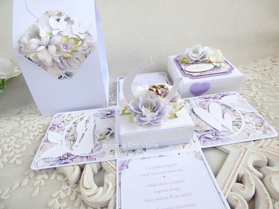 Komplet ozdobiony jest pięknymi papierami scrapowymi i tłoczonymi polskich producentów, kwiatami, małym pudełkiem na drobny prezent lub pieniądze o wymiarach 8x8x3,5 cm oraz innymi dodatkami.