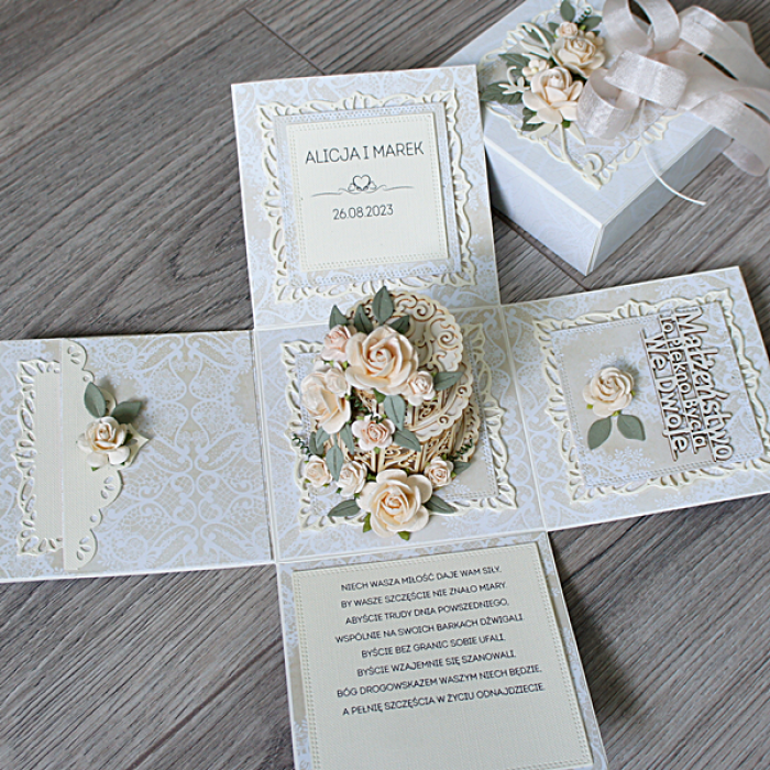 Exploding box wykonany z wykorzystaniem profesjonalnych materiałów, ozdobiony kompozycjami kwiatów, tekturkami, eleganckimi serwetkami. Całość utrzymana w jasnej, kremowej kolorystyce.