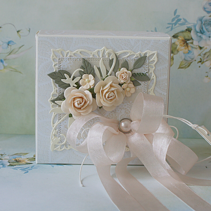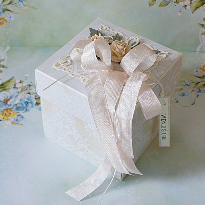 Oryginalny, bogato zdobiony exploding box utrzymany w kremowej kolorystyce z delikatnymi dodatkami.