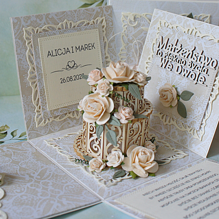 W środku umieszczony jest delikatny, koronkowy tort wykonany z tekturki, ozdobiony kaskadą papierowych różyczek, wycinankami.