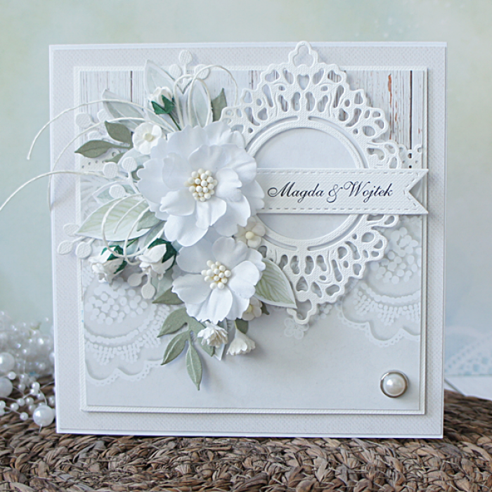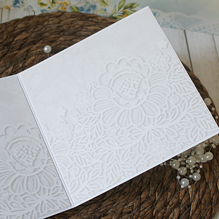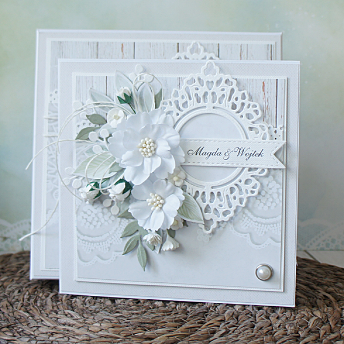 Komplet ozdobiony pięknym, eleganckim papierem polskiego producenta, przestrzennym bukietem.