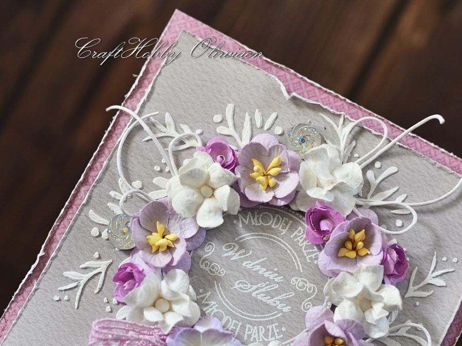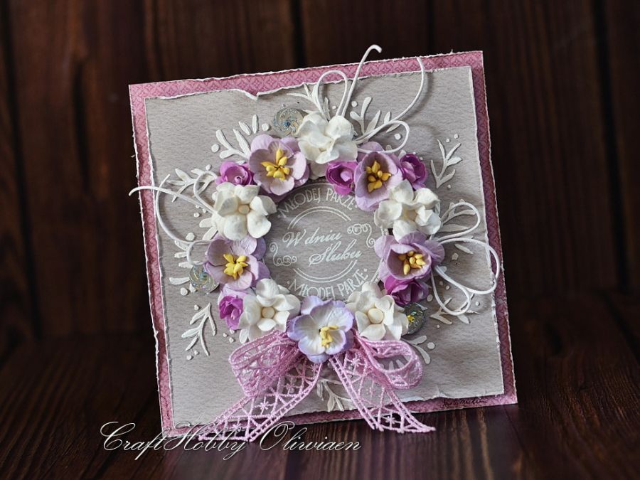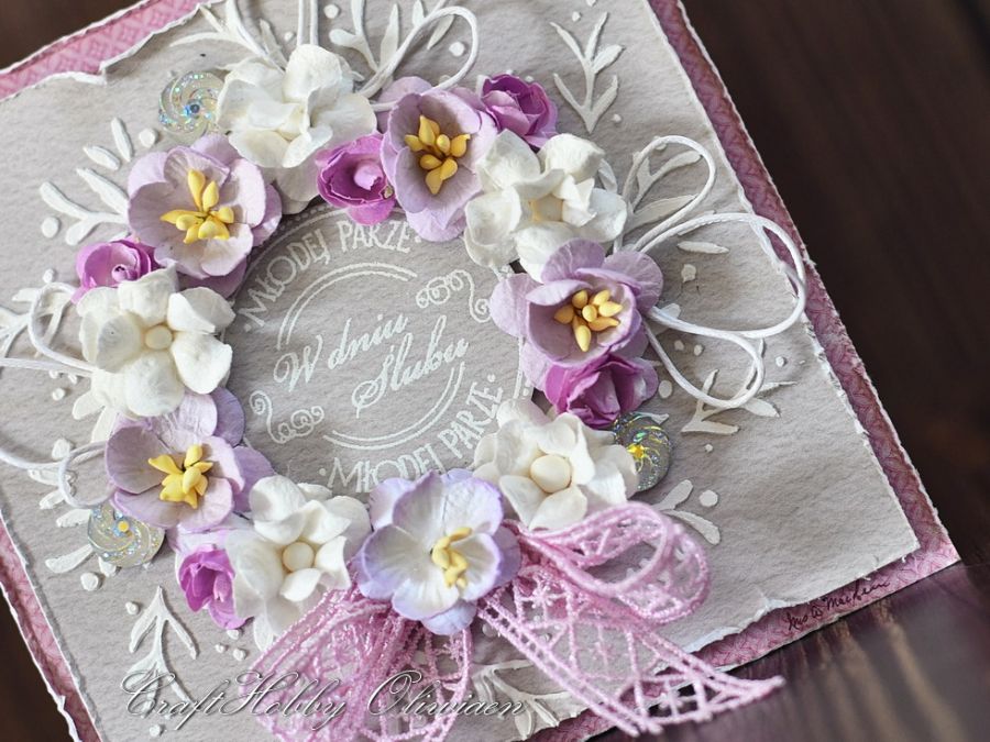 Kartka została wykonana z bezkwasowych papierów do scrapbookingu, ozdobiona motywem wieńca z pasty strukturalnej wypełnionego kwiatami mulberry i opalizującymi kamyczkami z koronkową kokardą. W centrum stemplowany i embossowany na biało napis.