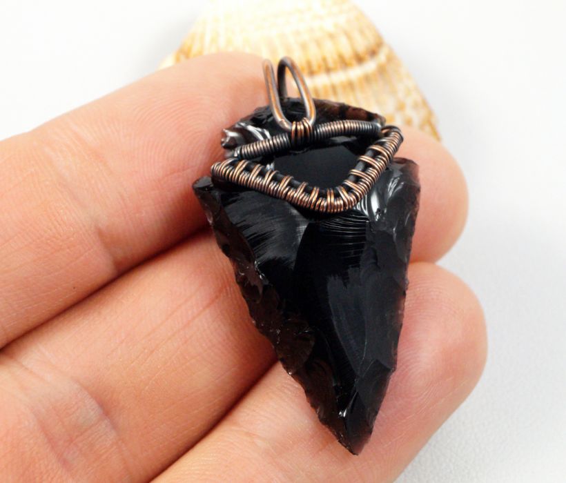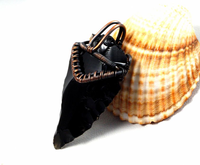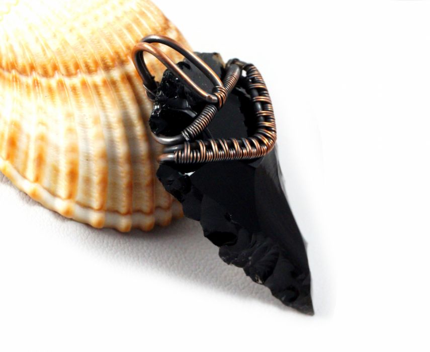 Bajeczny, misternie pleciony wisior z obsydianem (smocze szkło) w kształcie grotu.