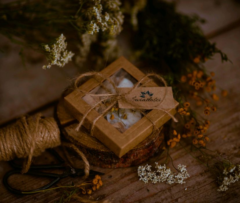 wosk sojowy, naturalne olejki eteryczne, suszone ozdoby, sznurek