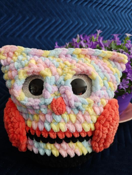 Ręcznie wykonana szydełkowa sówka z miękkiej, przyjemnej w dotyku włóczki.