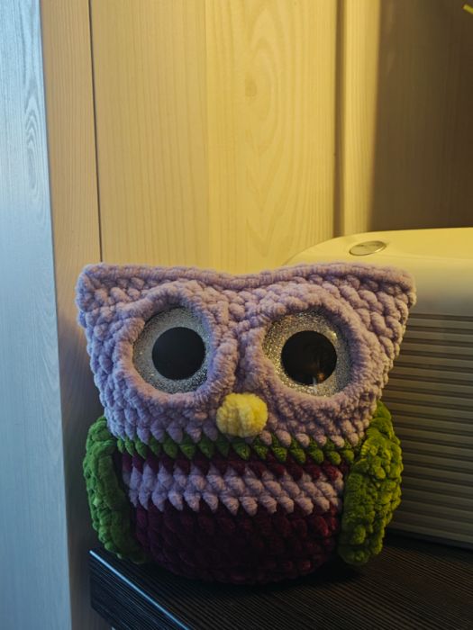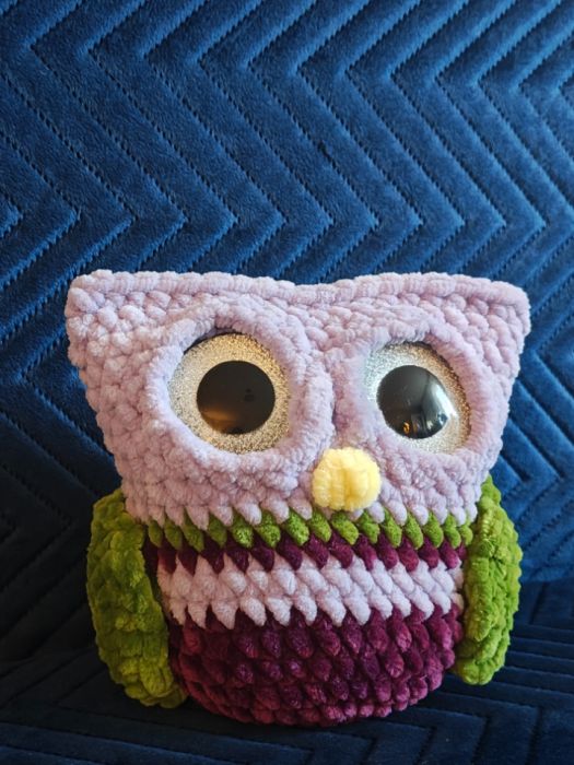 Ręcznie wykonana szydełkowa sówka z miękkiej, przyjemnej w dotyku włóczki.