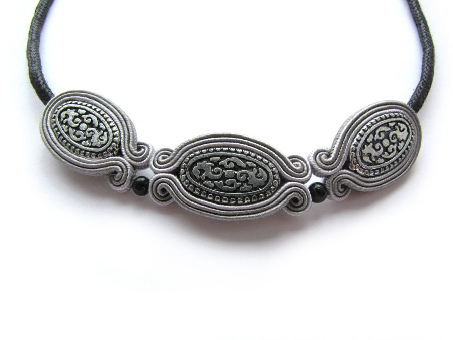 Wykonany z najlepszej jakości sznureczków sutasz, sznureczka woskowanego, akrylowych i szklanych koralików oraz elementów metalowych w kolorze srebra. Podklejony cienkim filcem, impregnowany co w znacznym stopniu chroni przed zabrudzeniami.