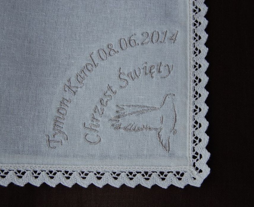 Szatka do chrztu - uszyta z białego lnu, obszyta dookoła białą koronką bawełnianą, w rogu wyhaftowany jasnoszarą nicią motyw gołąbka i napis Chrzest Święty oraz imię (imiona) dziecka oraz data chrztu.