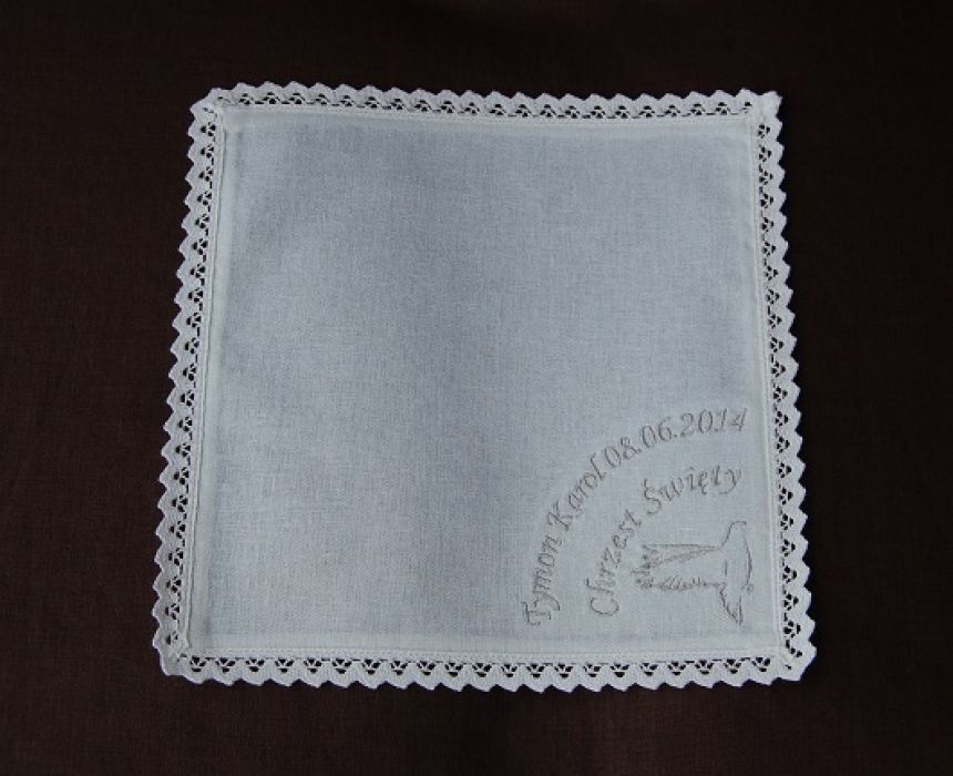 Szatka do chrztu - uszyta z białego lnu, obszyta dookoła białą koronką bawełnianą, w rogu wyhaftowany jasnoszarą nicią motyw gołąbka i napis Chrzest Święty oraz imię (imiona) dziecka oraz data chrztu.