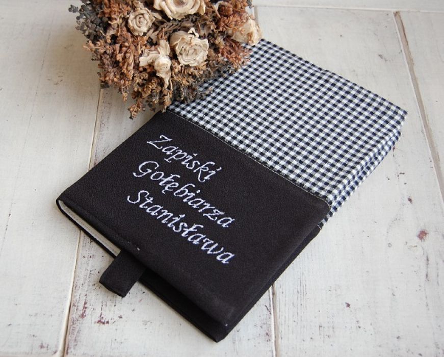 Spersonalizowany notes "B&W" - w jego skład wchodzi brulion 96cio kartkowy w kratkę (format A5) w twardej oprawie oraz materiałowa okładka. Okładka uszyta z połączenia czarnej elany i tkaniny w czarno-białą krateczkę. Na przodzie wyhaftowany (haft maszynowy) biały napis.(Przy składaniu zamówienia należy podać treść/imię jakie ma zostać wyhaftowane). W środek dana ocieplina, przez co jest miękka i puchata, wykończona od lewej strony podszewką. Dodatkowy atut to zakładka z czarnej tkaniny.