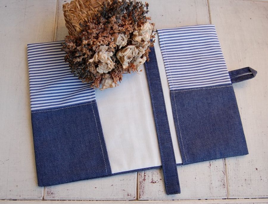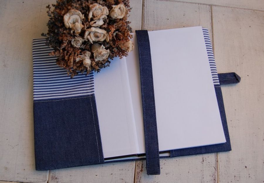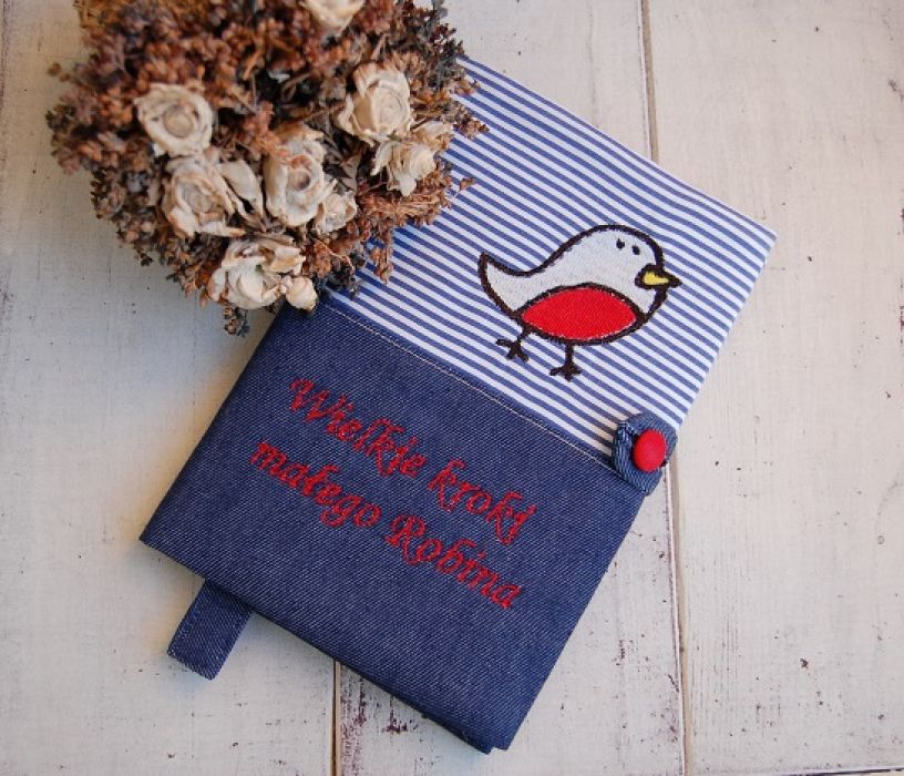 Spersonalizowany notes "Z nutą marine" - w jego skład wchodzi brulion 96cio kartkowy w kratkę (format A5) w twardej oprawie oraz materiałowa okładka. Okładka uszyta z połączenia granatowej tkaniny oraz bawełny w biało-niebieskie paseczki. Na przodzie, na dolnej, granatowej części wyhaftowany (haft maszynowy) czerwony napis.(Przy składaniu zamówienia należy podać treść/imię jakie ma zostać wyhaftowane). Na górze wyhaftowany ptaszek. (Zamiast ptaszka może zostać wyhaftowany inny motyw - np. kotwica - proszę pytać w celu uzgodnienia). W środek dana ocieplina, przez co jest miękka i puchata, wykończona od lewej strony podszewką. Dodatkowy atut to zakładka z granatowej tkaniny oraz zapięcie na czerwony guziczek.