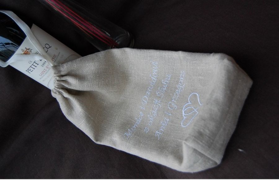 Woreczek na wino - wykonany z naturalnego lnu, z wyhaftowanym białym napisem/dedykacją. Treść tekstu, jaka ma zostać wyhaftowana, proszę podać przy składaniu zamówienia. Ściągany z jednej strony na bawełnianą tasiemkę.