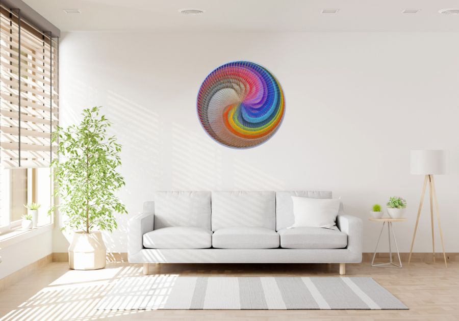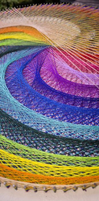 Ten niezwykły obraz został wykonany w technice String-art, w której setki kolorowych nici tworzą hipnotyzującą, geometryczno-abstrakcyjną kompozycję. Każdy detal został starannie zaplanowany i wykonany ręcznie.