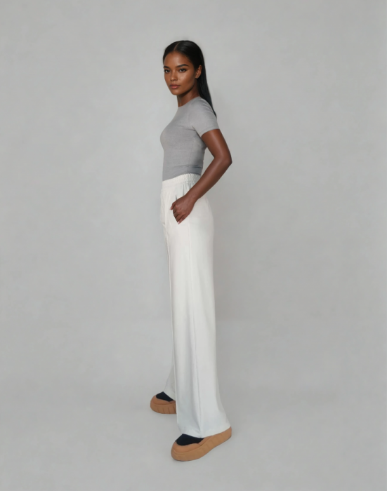 Stylowe damskie spodnie w kolorze ecrii na wysokiej gumie z szerokimi nogawkami wykonane z bardzo dobrej jakości dzianiny dresowej to połączenie elegancji i wygody.