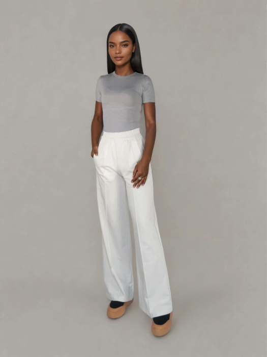 Spodnie posiadają wysoki stan, który podkreśla talię i zapewnia idealne dopasowanie.