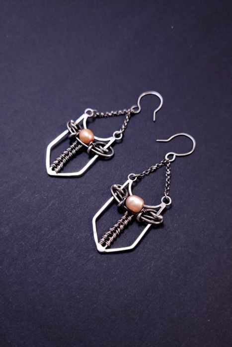 Zadaj pytanie dotyczące produktu: Srebrne kolczyki z różową perłą | Eleganckie kolczyki z motywem miecza