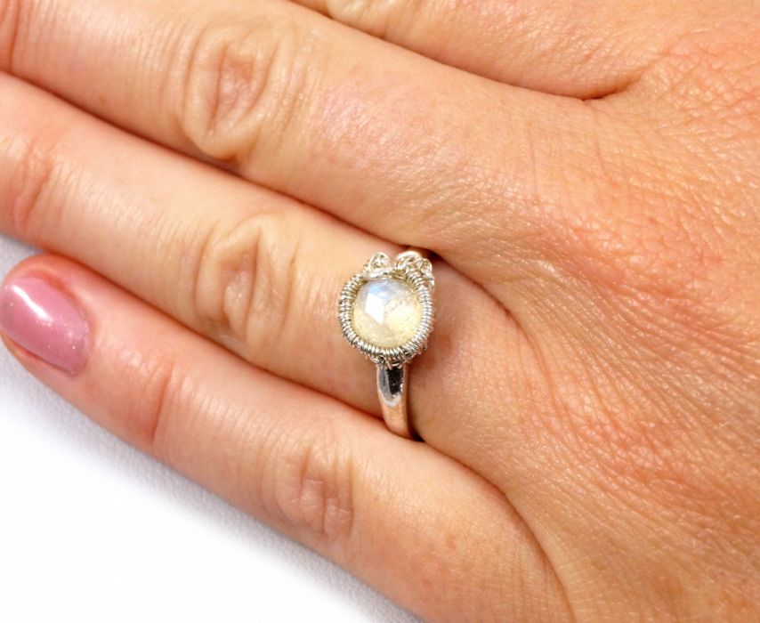 Misternie wykonany pierścionek z fasetowanym kaboszonem kamienienia księżycowego.