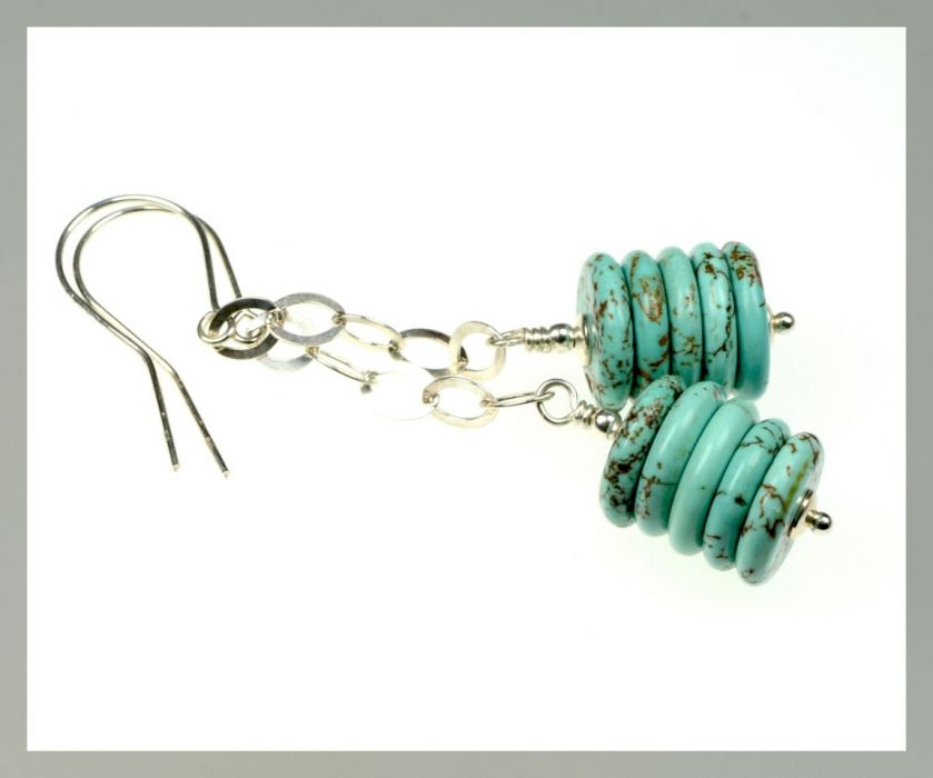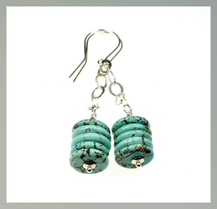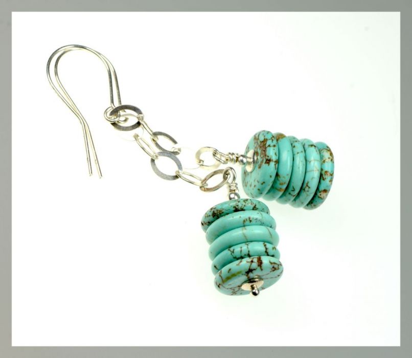 Oryginalne kolczyki w całości wykonane ze srebra próby 925 oraz pięknych kamieni Turkusu. Bigle otwarte.