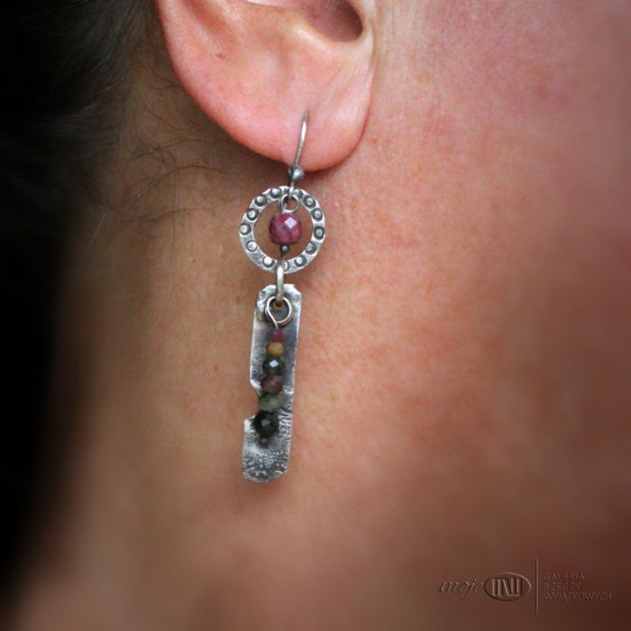 Kolczyki ze srebra, turmalinu i szafiru z rubinem. Ręcznie kształtowane srebro, delikatnie oksydowane i przetarte dla wydobycia faktury. Centralnie wisi fasetowana oponka szafiru z rubinem. Proste bigle ze srebrnego drutu.
