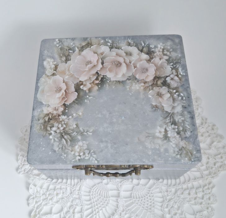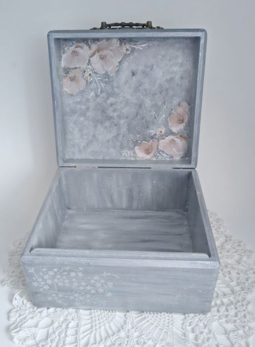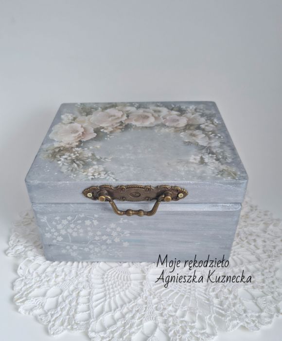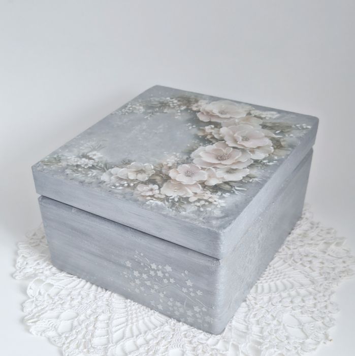 Wyjątkowa, ręcznie wykończona szkatułka, utrzymana w delikatnych odcieniach szarości i srebra, ozdobiona kwiatowym motywem w formie pastelowego wianka, idealnie wpisuje się w stylistykę shabby chic i vintage. Metalowe zapięcie dodaje całości ponadczasowego uroku.