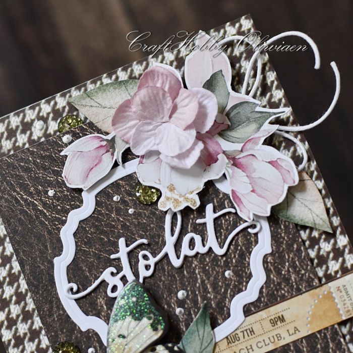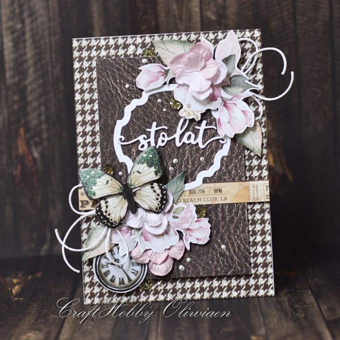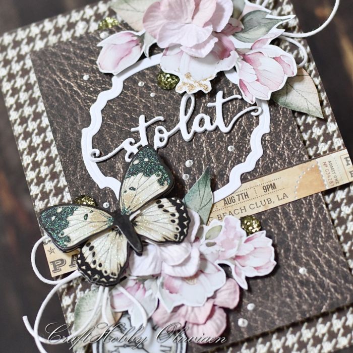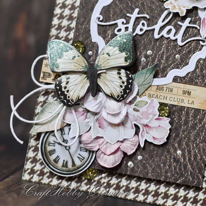 Kartka wykonana z bezkwasowych papierów do scrapbookingu, ozdobiona motywami wycinanymi z papieru, warstwowym motylem, hortensjami mulberry, sznureczkiem, złotymi perełkami i cekinami.