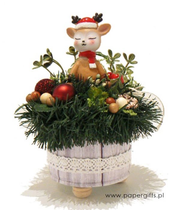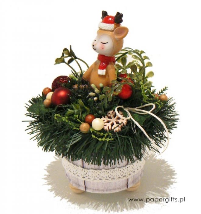 Przepiękna ozdoba bożonarodzeniowa z figurką z żywicy w kształcie Jelonka w czapce Mikołaja. Dekoracja świąteczna wykonana na metalowej podstawie oklejonej papierem z motywem bielonego drewna i bawełnianą koronką. Ozdobiona sztucznym łańcuchem, bombkami, zielonymi gałązkami, czerwonymi i białymi kuleczkami. Idealna jako ozdoba świątecznego stołu, firmowego biurka lub jako dodatek do prezentu dla bliskiej osoby. Wysokość stroika z dekoracjami ok. 15 cm, średnica podstawy ok. 7 cm.